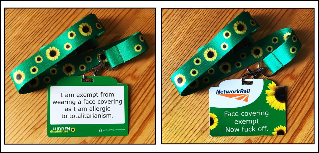 I’ve created a permanent slot down here for people who want to buy (or make) a “Mask Exempt” lanyard/card. You can print out and laminate a fairly standard one for free here and it has the advantage of not explicitly claiming you have a disability. But if you have no qualms about that (or you are disabled), you can buy a lanyard from Amazon saying you do have a disability/medical exemption here (now showing it will arrive between Oct 5th to Oct 15th). The Government has instructions on how to download an official “Mask Exempt” notice to put on your phone here. You can get a “Hidden Disability” tag from ebay here and an “exempt” card with lanyard for just £3.99 from Etsy here.