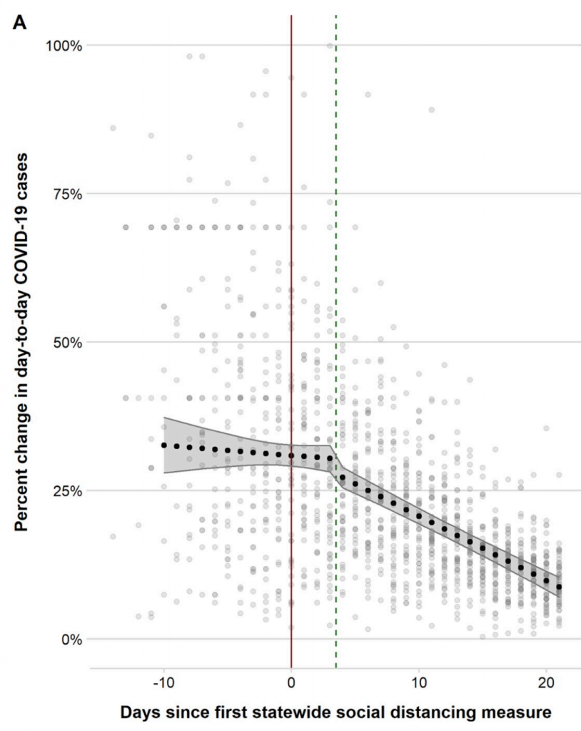 This is a secondary finding of the paper, and is acknowledged slightly sheepishly and a bit awkwardly. The main body of the paper looks at the daily growth rate in cases (i.e. positive tests) before and after the introduction of social distancing measures. Happily, the authors acknowledge that the growth rate in cases was indeed slowing before the introduction of a state’s first social distancing measure (i.e. the growth in cases was not exponential), though they do not seem to have much of a handle on quite how fast it was decelerating. That’s the line of black dots to the left of the dashed green line below – it basically means they aren’t sure what the gradient should be. As such, the central claim that the growth rate in cases decelerated faster after the introduction of social distancing measures (the line of black dots to the right of the dashed green line) is rather holed below the waterline: eyeballing the data, I could just as easily fit a single straight line through the data, or more convincingly a modest curve, which might well make more sense.