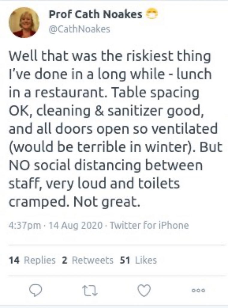 This tweet from Catherine Noakes, Professor of Environmental Engineering for Buildings at the University of Leeds, is revealing. Why? Because she’s a member of SAGE. Surely, as a scientist, she should know that her chances of dying from COVID-19, given that she’s under-65, are lower than dying in a road traffic accident? Indeed, people of all ages are six times more likely to die of flu or pneumonia at the moment, according to the ONS. Did Professor Noakes refuse to go to restaurants during the winter of 2017-18? There were 50,000 excess deaths that winter, likely due to seasonal flu and unusually cold weather. That’s more deaths than there have been from Covid to date.