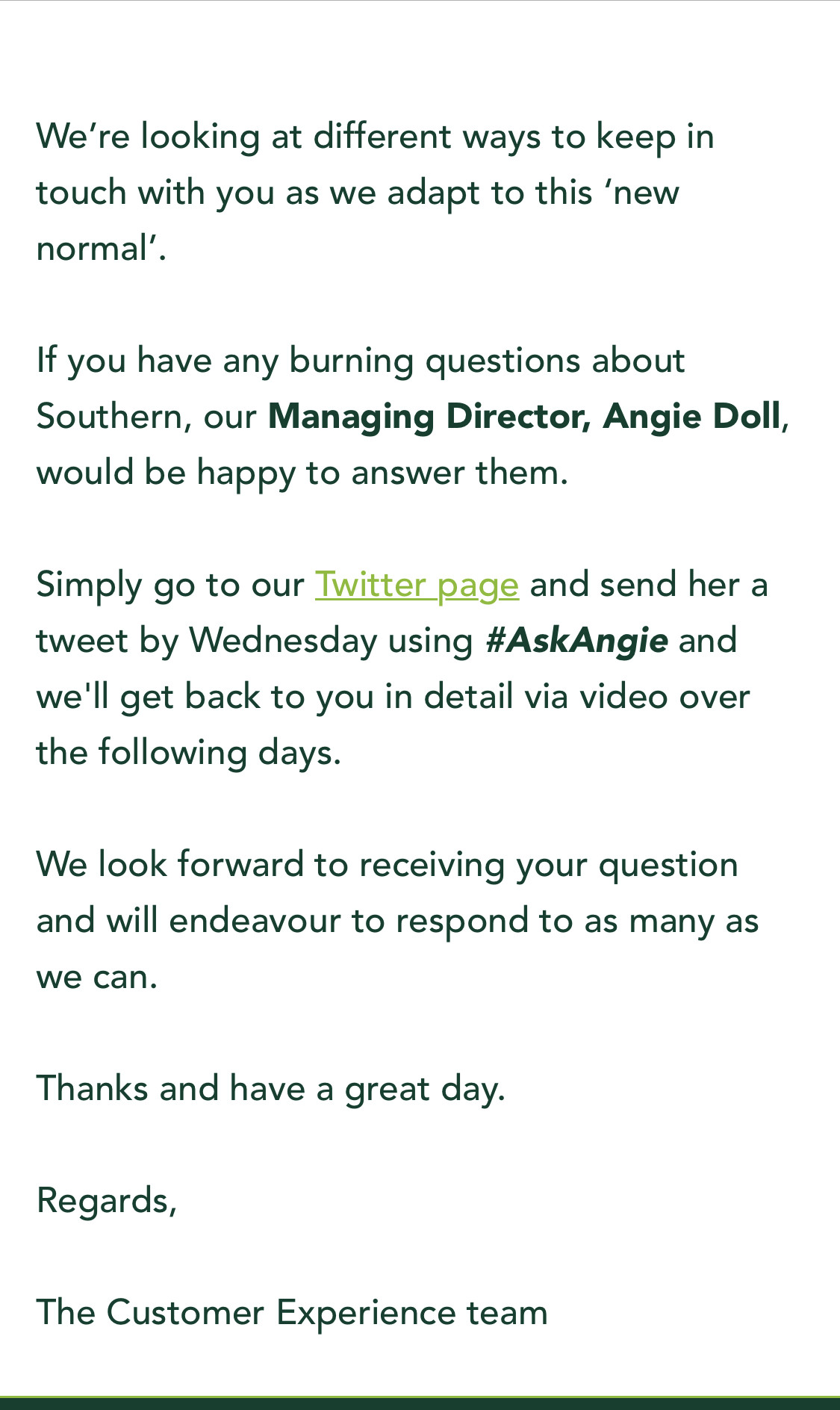 Got the below from Southern Rail today. I’m trying very hard not to electrically swear at the morons. ‘This’ is no longer new, and it’s definitely not normal. I shall probably not dignify the ‘children’s television’ tone of the email with even a vitriolic reply. Plus #AskAngie appears to be a Realtor’s handle in Orange County Calif.