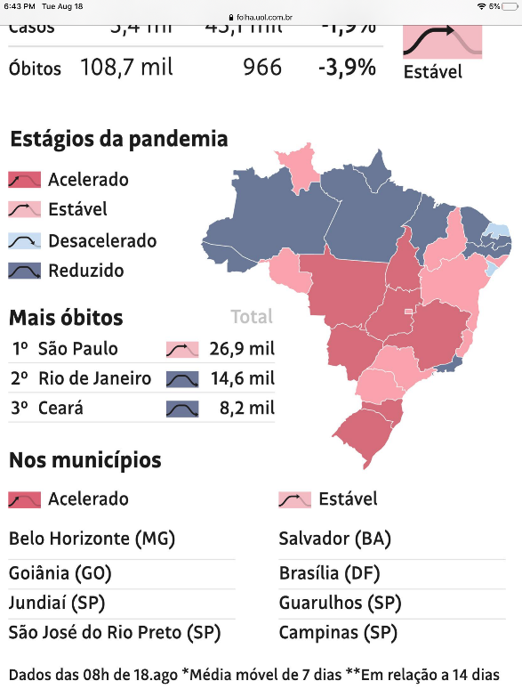 In Brazil, while great swathes of the country are now basically back to normal, the case and death growth in Brazil is now being driven by a raging epidemic in the densely populated far south and the much poorer central core of the country. Here’s a map, published daily in the national newspaper. Red areas are where the epidemic is growing, pink areas are where it is stabilising, light blue is where it is slowing down, and deep blue is where it has been permanently reduced. Anyone who wants to see the progress of the epidemic in Brazil just needs to go to the Folha De São Paulo newspaper website and see this map updated. No need to read the articles.