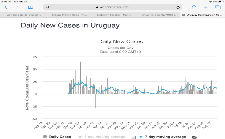 Oh, and one more thing. Is there another outlier country in South America? Yes. Brazil’s peaceful southern neighbour, Uruguay. One of the lighest Covid death tolls on Earth, one of the lowest caseloads of any country.