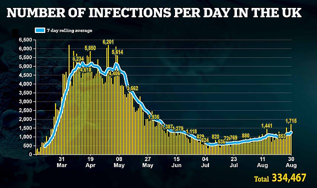 The Mail says that 1,715 people tested positive for coronavirus on Sunday, the biggest daily rise in 12 weeks.