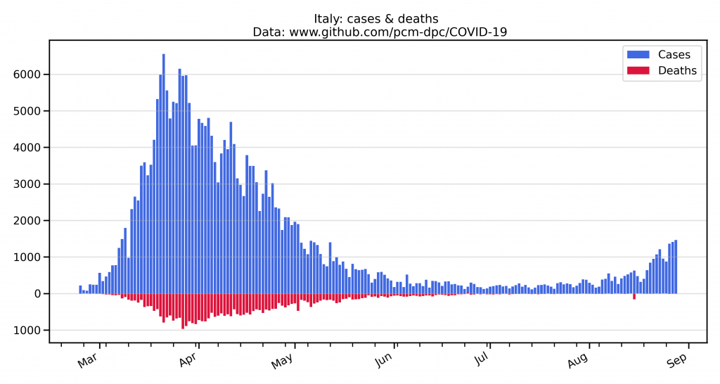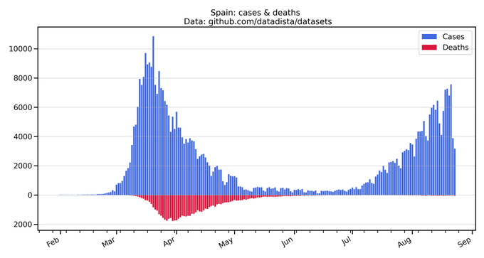 In case anyone thinks the rise in the number of people testing positive in Europe is cause for alarm, here are four charts showing cases and deaths in Italy, Spain, the UK and France.