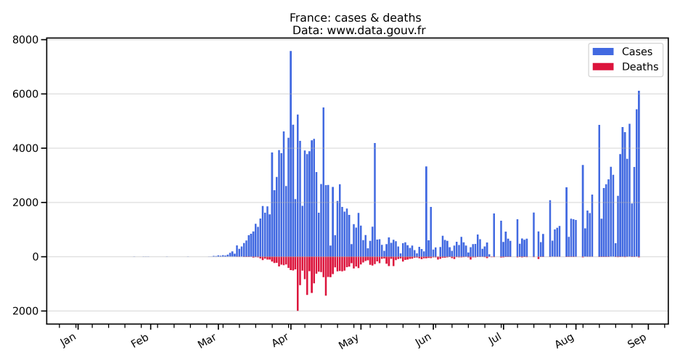 A few reasons Firstly, the increase in community testing means that infections are being found that otherwise would have been there anyway, but undetected because symptoms are either very mild or not present at all. An inevitable false positive rate from the tests (whatever that false positive rate is) will also necessarily be inflating the numbers. Secondly, as compared with March, when “case numbers” were at similar levels, larger numbers of the people being tested are either not sick, or not very sick. In March, only people ill enough to be admitted to hospital (plus healthcare workers) were being tested, meaning that a higher proportion of them would have been sick enough for the disease to kill them (or contribute to their deaths). People being tested now are mostly people who decide to get tested because they have mild symptoms, or just for the hell of it because they have no symptoms at all. You can see this in the France numbers – a significant jump in cases in mid August, when the rules were changed so that you could get a test without a doctor’s prescription (the doctor’s prescription indicating that you probably had symptoms). Thirdly, these “cases” are… Read more »