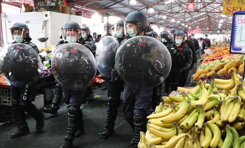 A small anti lockdown protest in Melbourne descended into chaos today as over 300 police in full riot gear corralled the group of protesters into a nearby fresh produce market. Clashes ensued as arrests were made and protesters hurled florets of broccoli and assorted fruits at the police amid cries of FREEDOM. The number of protestors was small (estimated at under 100) as organisers who posted details on Facebook were arrested days before, as well a number of others who simply liked their posts. No I am not making this up ! Gives new meaning to the term Banana Republic