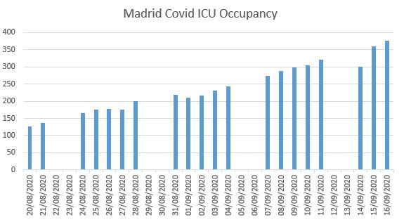 Steady growth, certainly, but not exponential. In terms of being at “saturation point”, Covid patients currently occupy 22% of Madrid’s hospital beds and 8.5% nationally, so still plenty of spare capacity. The rise so far has been steady rather than steep or “exponential”.