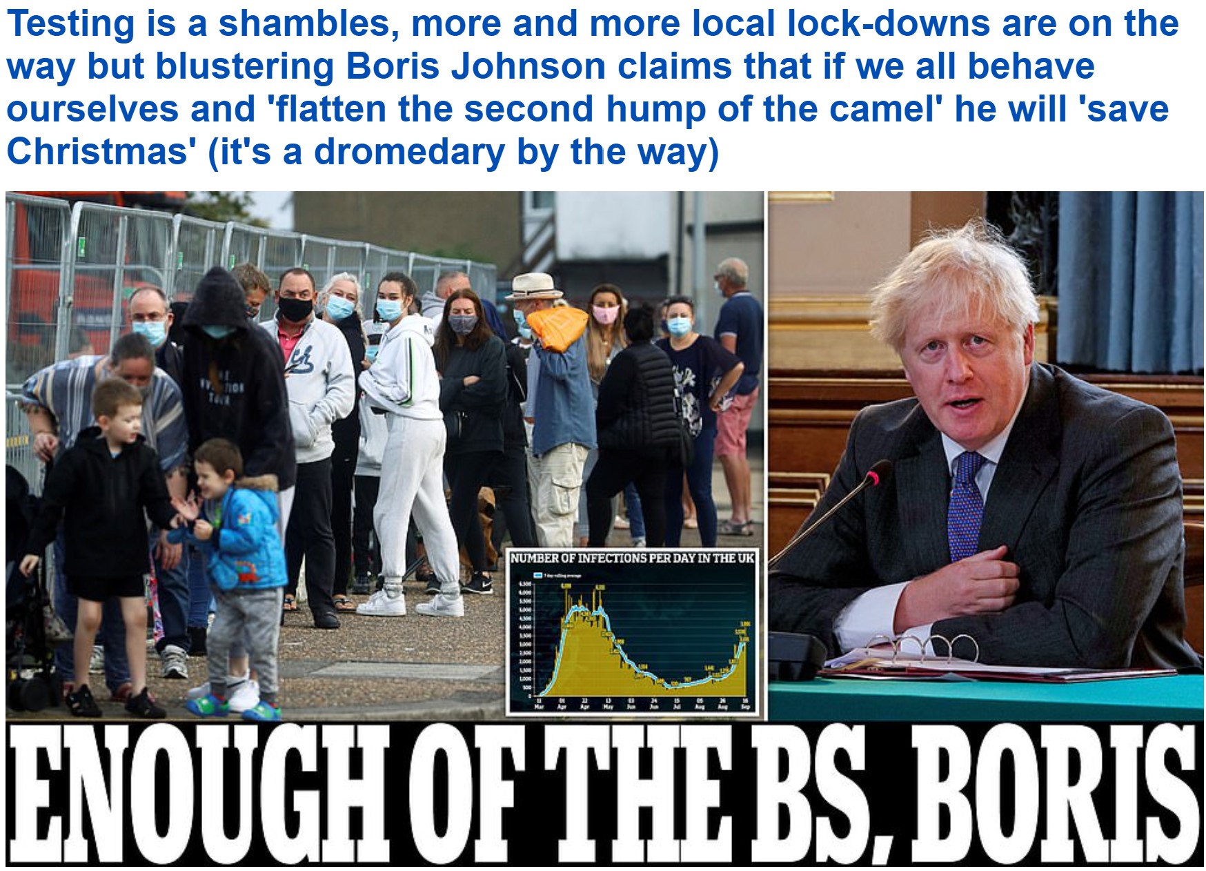 Watched the 1pm BBC TV News today. Testing delays are the new Death Porn. They flogged the story out for 10 minutes at the top of the bulletin, doing everything conceivably possible to freak people out about a test shortage, weaving second wave references in and out, interviewing enraged test-wannabees, following the government line so slavishly they’ve managed to leave the flailing government behind unable to match testing to the extent the BBC has whipped up Second-Wave Terror. They’ve obviously all been watching Game of Thrones since the slogan du jour is “with winter approaching” (aka Winter is Coming), making it sound like twenty-feet deep snowdrifts and -40C gales are due any minute along with Monty Python ‘bring out your dead’ carts in every street.