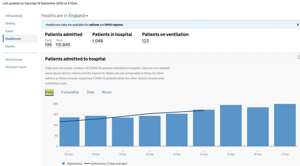 If you go to the Government’s COVID-19 dashboard and look at the data for daily Covid admissions to English hospitals (see below), it increased from 143 to 199 in the eight-day period to September 17th, the day Hancock was speaking. That’s not “doubling”. What about daily admissions for the whole of the UK? It increased from 196 on Sept 10th to 241 on Sept 17th. Again, not “doubling”.