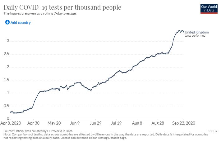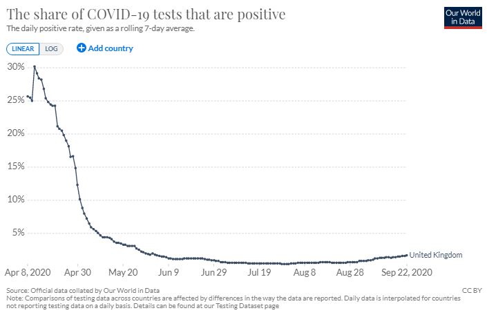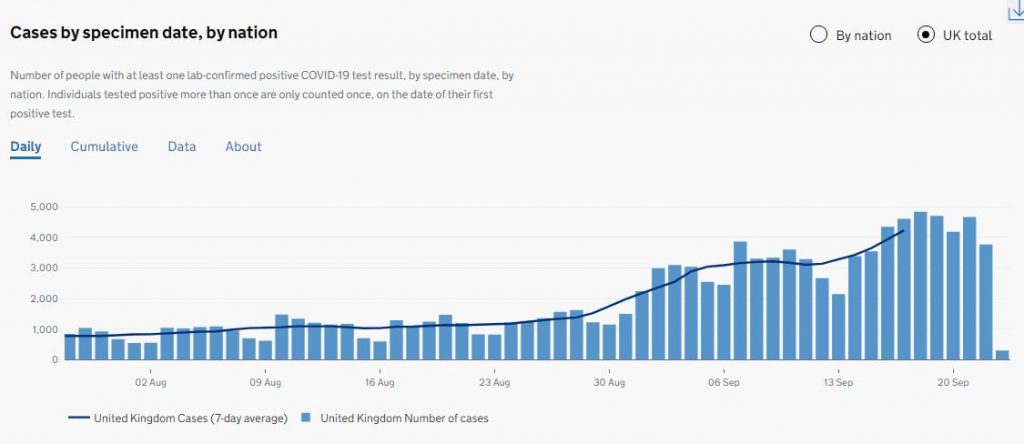 As it happens the positive rate has increased a bit during September, from 0.6% on August 26th to 1.2% on September 8th and 1.7% on September 22nd (the latest date for which we have data). That means it doubled in 13 days to begin with and since then, 14 days later, only increased by a further 42% (100% would be doubling again). So it initially doubled at around half the rate of the Government’s “every seven days” and then slowed down, though did pick up again a bit in the past week (growing 30% between September 15th and September 22nd, a doubling time of around two and a half weeks if it continues). This suggests the current level of growth is not exactly “exponential” and may already be beginning to peak. Of course, we will have to wait and see what comes of the latest rise. But the question at this point is why the Government is making a show of dubious projections of exponential growth from raw case data and not setting out the much less troubling reality.