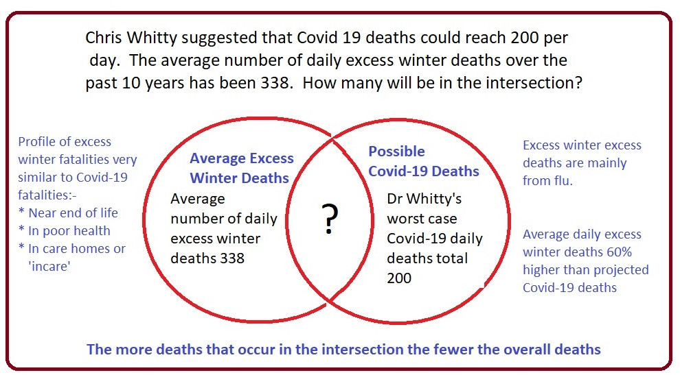 Chris Whitty’s worst case projection of 200 daily Covid-19 deaths is only 60% of the average level of excess daily winter deaths of 338 (average excess winter daily deaths 2010-2019 = 338).