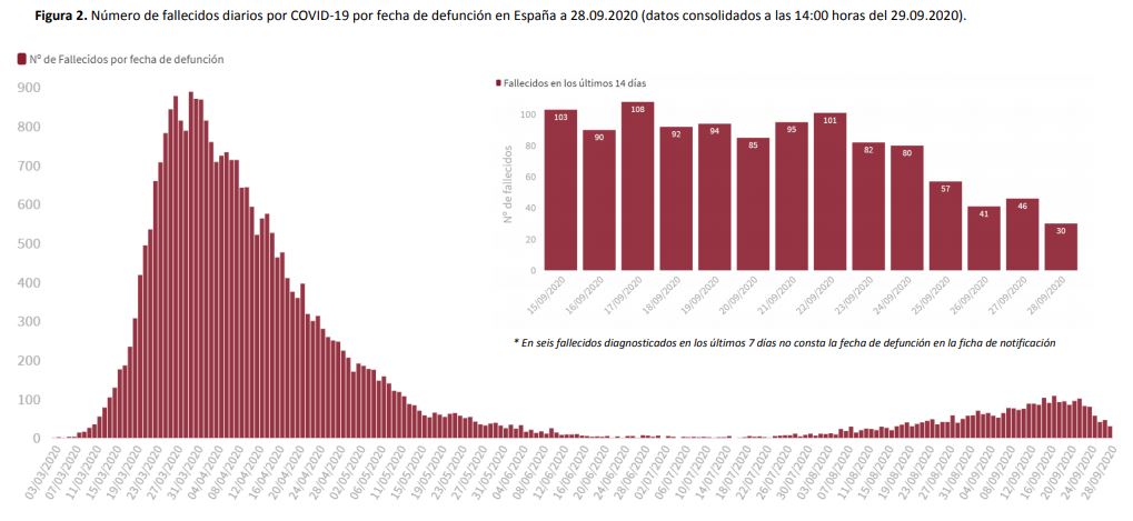 Sounds frightening, right? But here’s what they don’t tell you. The epidemic in Spain peaked weeks ago. According to the Carlos III Public Health Institute new cases by date of symptom onset peaked and plateaued by the end of August. Here’s the graph, courtesy of the Centre for Evidence-Based Medicine: