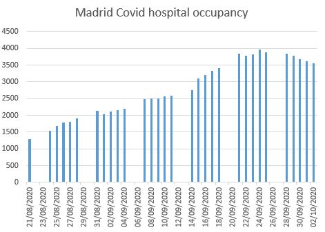 Meanwhile, in Madrid, dubbed the “capital of Europe’s second wave”, hospital occupancy continues its downward trend, now sustained for over a week. Importantly, the decline in infections predates any Government intervention, showing that it is most likely the result of acquired population immunity. And, of course, the Spanish Government has ignored this positive data and just placed Madrid under a local lockdown of sorts, imposing a rule of six and a 10pm curfew.
