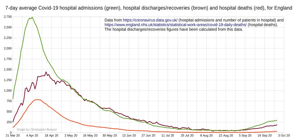 It’s not perfect, I had to take the deaths data from NHS England as the coronavirus.data.gov.uk deaths include deaths outside hospitals, and even then the results jumped around a bit – hence I’ve only plotted the 7-day averages on the graph, to smooth this out a bit.