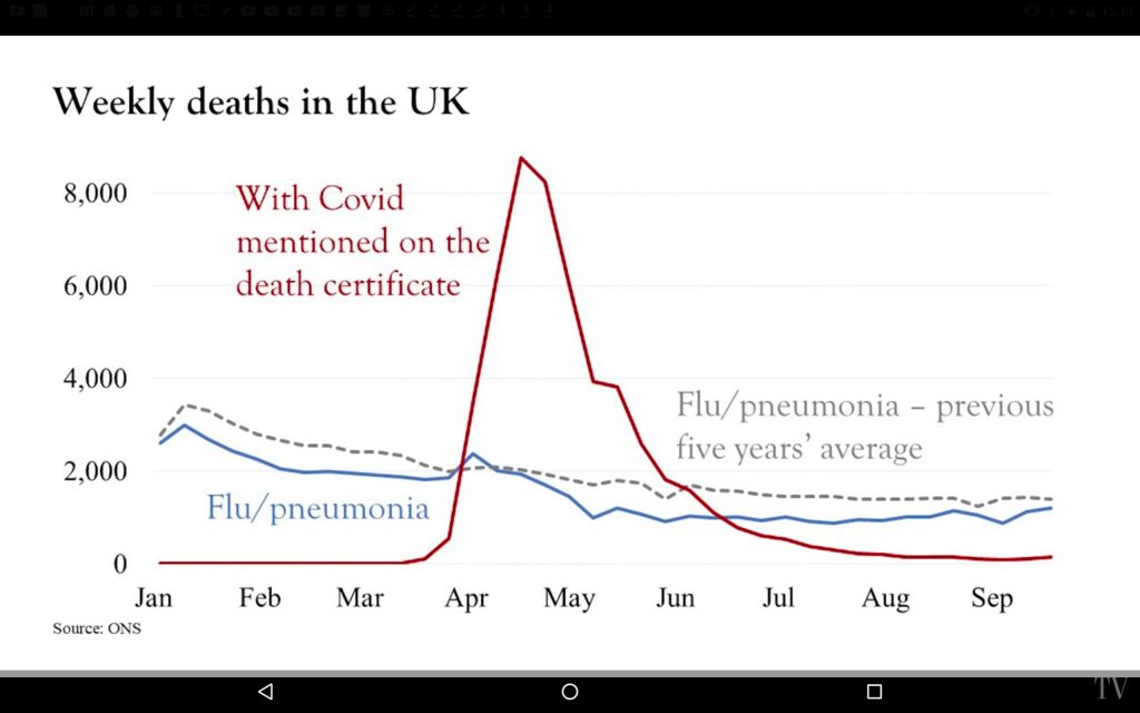 A reader took a screen grab of the above ONS chart in the most recent episode of Andrew Neil’s show on Spectator TV comparing deaths from flu and pneumonia in 2020 with the five-year average. They were fractionally below at the beginning of the year and they’re fractionally below now, but have tracked the five-year average pretty consistently since January 1st. This begs the question: if the Government’s non-pharmaceutical interventions did little to stop transmission of flu and pneumonia, why should we think they’ve done anything to prevent the transmission of SARS-CoV-2?