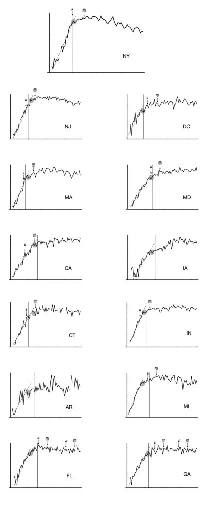 The lockdowns can’t be the cause of these transitions. In the first place, the transition happened even in places without lockdown orders (see Iowa and Arkansas). And where there were lockdowns, the transitions tended to occur well before the lockdowns could have had any serious effect. The only possible exceptions are California, which on March 19 became the first state to officially lock down, and Connecticut, which followed four days later.