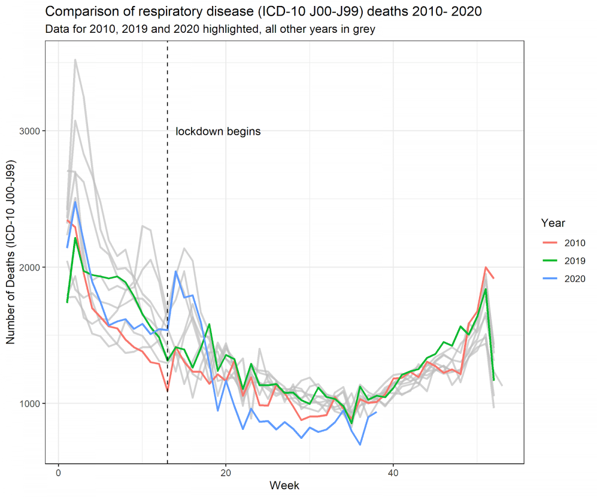 COVID19 has a different ICD10 code of 100 so is not recorded in that dataset.The plot shows that for all other respiratory diseases of interest, this year is little different to the past five. However comparing all deaths to the same Week 39 time point, 66,000 extra people have died from something that they did not die of in the past five years.