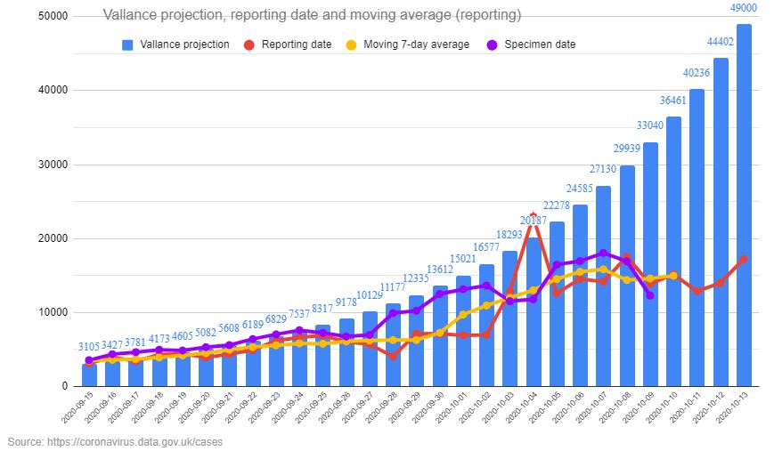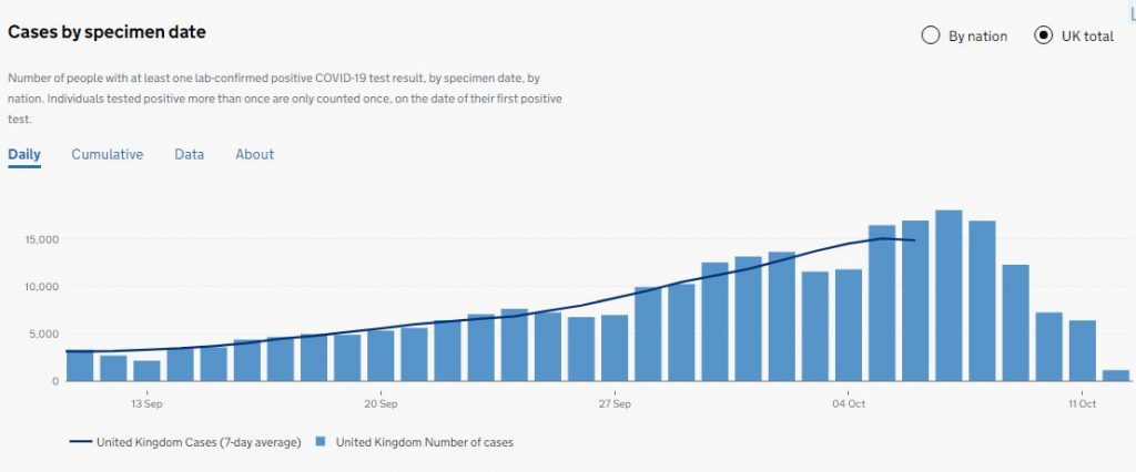 Now where have we heard that before? That’s right, on September 21st when Witless and Unbalanced presented us with their Graph of Doom predicting nearly 50,000 cases per day by October 13th. How’s that getting on?