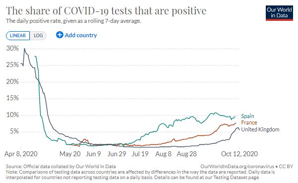 Maybe “cases” will shortly start going up again, but that is no excuse for misrepresenting the current situation. Are they likely to though? Here are the positive rate curves for the UK, Spain and France, with little sign of runaway growth, so you’d have to bet against it.