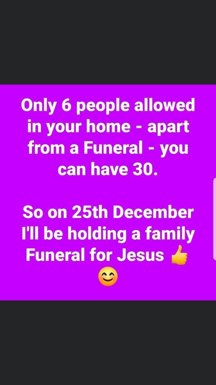 Pic illustrates the ridiculousness of regulations. Everyone I know whether family or friends is going to ignore restrictions over Christmas period. Thereafter it will be impossible to enforce.