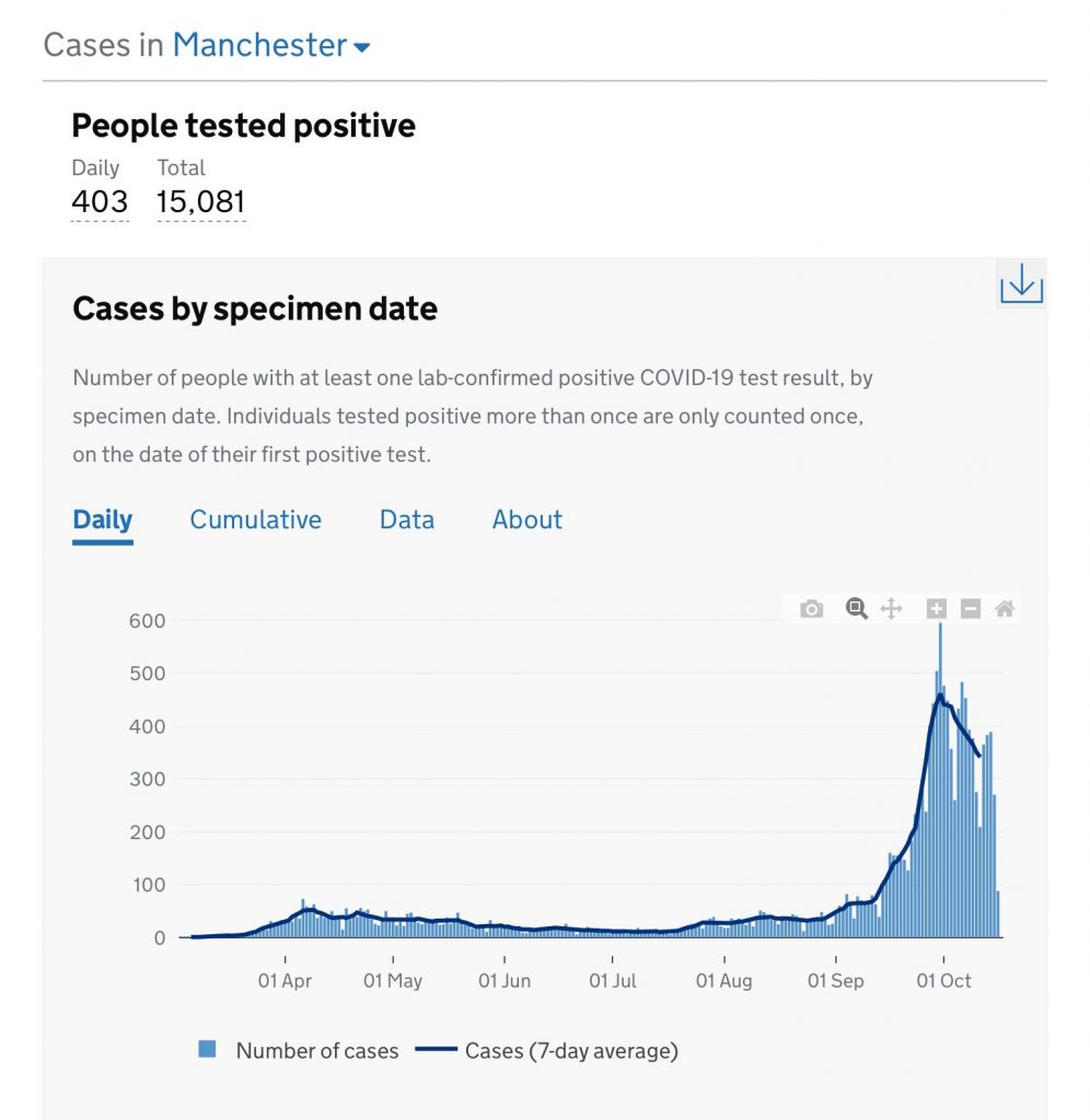 But how accurate is this “leaked document”? Not very, judging from the assessment of Prof Carl Heneghan and his colleagues in the Sunday Telegraph. Readers will recall that they point out the number of daily cases in the Manchester area are falling.
