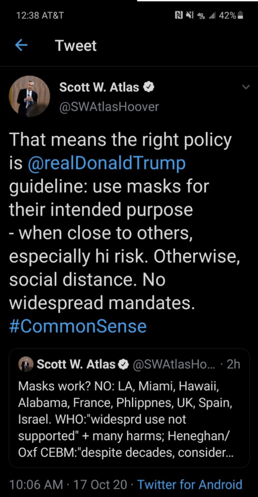 Atlas, a senior fellow at Stanford’s Hoover Institute, not only had his tweets removed, he was banned from tweeting until he deleted the tweets that Twitter for unclear reasons objects to. Here are the tweets in question: