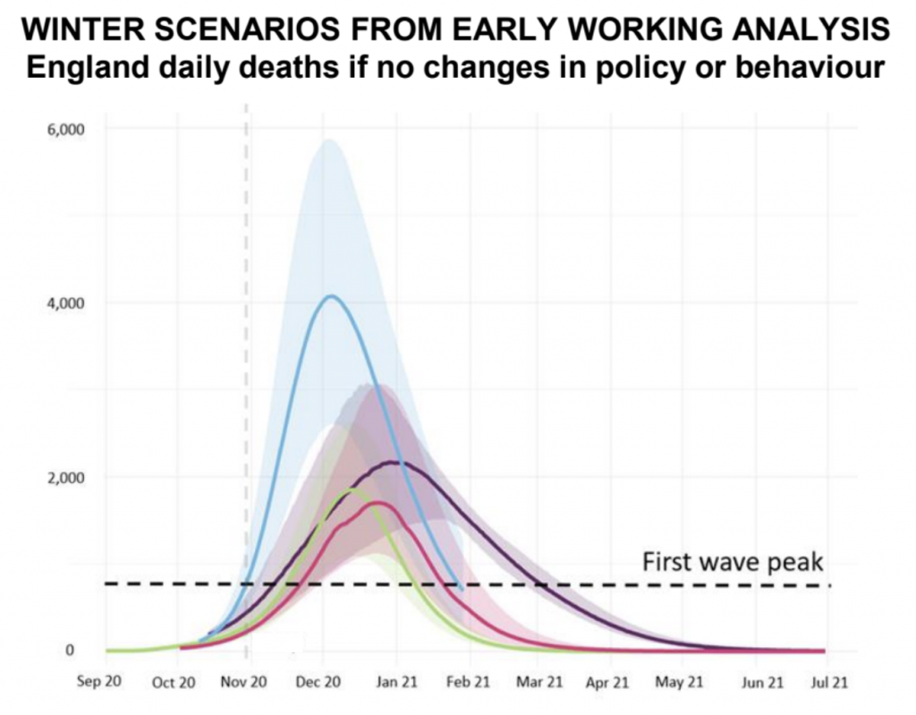 The above graph is quite a departure from previous understanding of Covid’s potency. We now see second-wave deaths dwarfing not only those from the first wave but those envisaged by the Government’s official ‘realistic worst-case scenario’ (RWC) for the coming winter. The RWC was a secret until the Spectator published it a few days ago, showing deaths peaking at about 800 a day. Here it is.