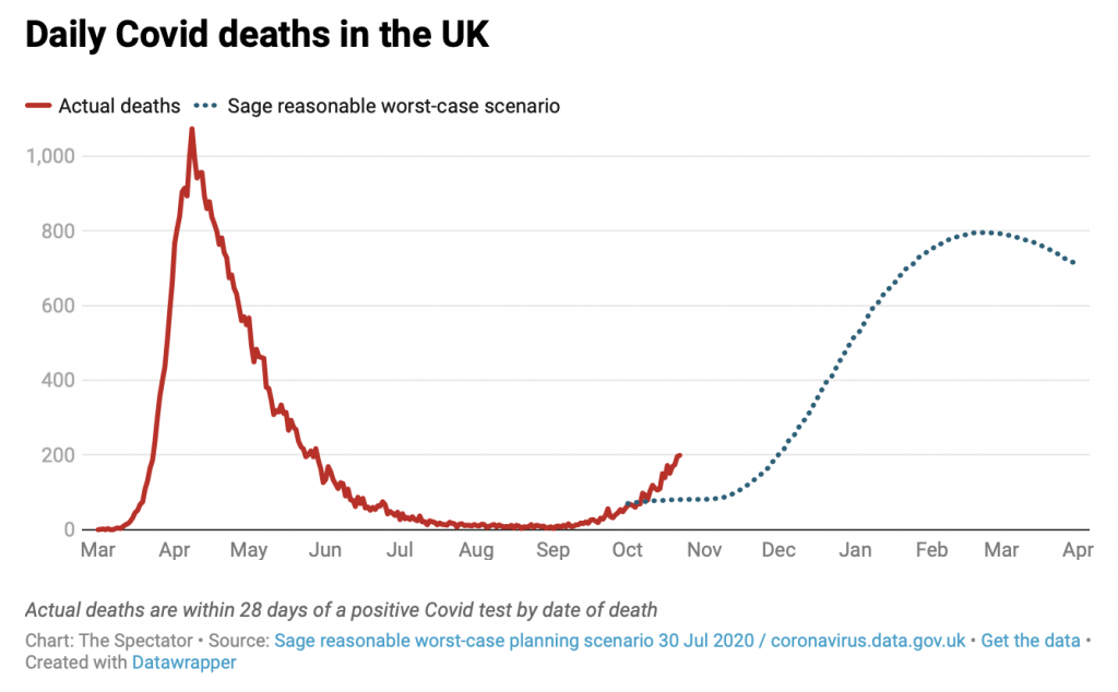 Spectator editor Fraser Nelson wrote a terrific blog post on Saturday evening, querying where SAGE got its 4,000 deaths-a-day figure from. Remember, it was this modelling that frightened Boris into abandoning his ‘middle path’ strategy in favour of a second lockdown.