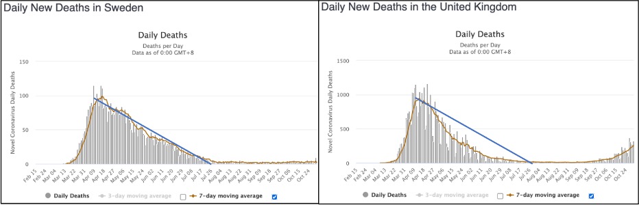 But there clearly are increasing Covid hospitalisations and deaths currently happening in the UK and in other places. My hypothesis below is that this is because the epidemic was artificially suppressed in April, and now reality is catching up again. The Grim Reaper wants his souls. And I think we can make a reasonable prediction of how many he is coming for, based on how many we tried to prevent him getting the first time around. Apparently, deaths during respiratory epidemics normally follow the Gompertz curve, a feature of which is the straight line decline once the epidemic has peaked. A comparison between Sweden and the UK shows this.