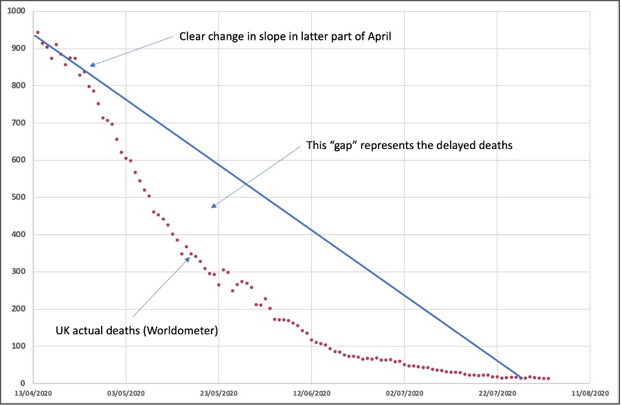 The artificial suppression of the virus progress back in March and April took the UK off the natural Gompertz trajectory. The change in the slope is clearly visible around the last week in April. What I am proposing here is that those lives which were saved from the end of April through to the end of July were only really delayed deaths, as this virus is not eradicable. And now they are due. And they are also predictable. If we look at the UK in more detail (showing actual seven day average death counts):