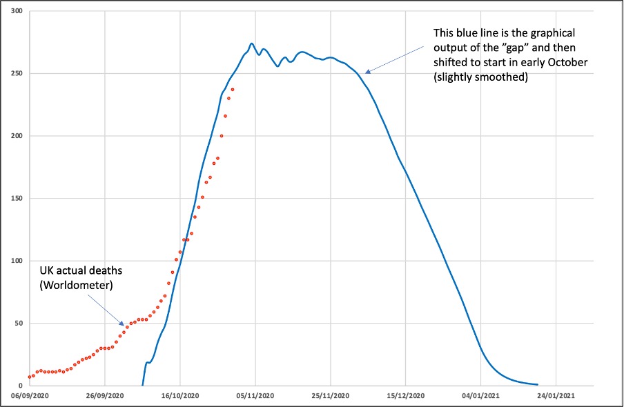 And then all I have done is the graph up these daily ‘missing deaths’ that were the ‘gap’ between April and July, and overlay them against what is being observed as ‘the second wave’. As can be seen in this graph, the fit to the actual rise in cases in October is actually quite good. Up until now.