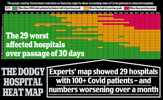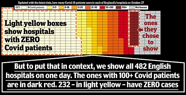 Take the heat map, for instance (see above). Ross points out that only 29 hospitals are shown on the slide, but the full dataset, published by NHS England, actually includes 482 NHS and private hospitals in England – at least 232 of which (and probably more as some entries were left blank) had not a single COVID-19 patient on October 27th. Hardly surprising since official figures showed there were 9,213 patients in hospital with the disease on October 31st, compared with 17,172 at the spring peak.