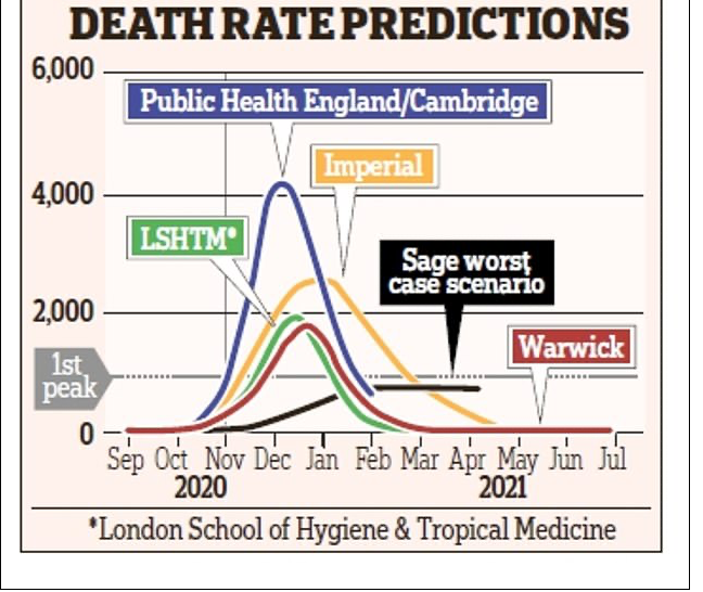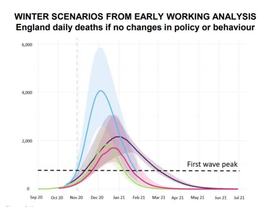 Modelling presented by Sir Patrick, the government’s Chief Scientific Advisor, showed that under a worst case scenario 4,000 deaths-a-day could occur by December 20th – four times more than the worst day of the first peak.