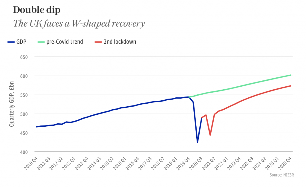 Britain is teetering on the brink of a dreaded double-dip recession following the Prime Minister’s ban on household mixing and non-essential travel coupled with mass pub and restaurant closures, experts at the National Institute of Economic and Social Research (Niesr) warned.