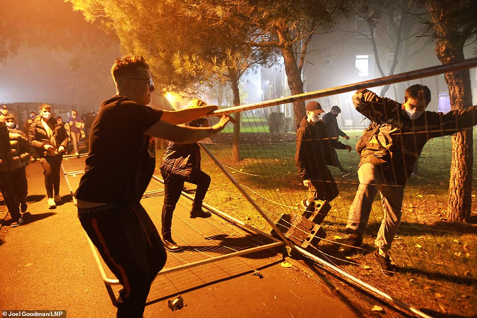 Furious students last night ripped down a metal fence erected around their halls on the first day of England’s new coronavirus lockdown.
