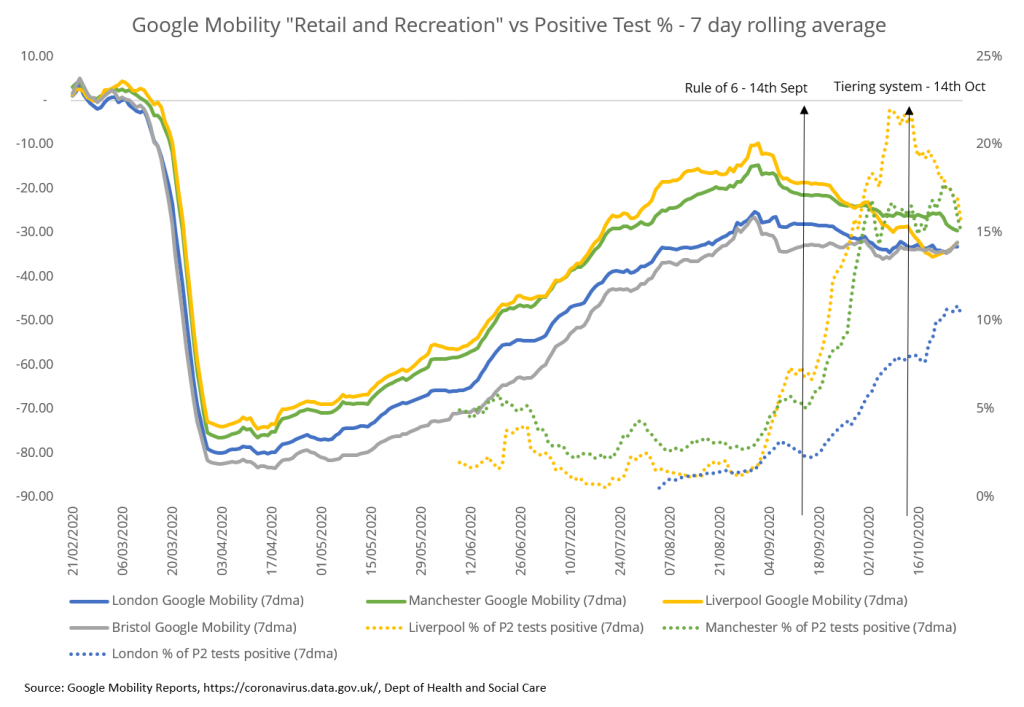 The absence of any discernible change in retail and recreation mobility when major restrictions like the Rule of 6 came in speaks against the efficacy of the measures. While we can see an impact on mobility data in, say, Manchester when it moved to Tier 3 on October 23rd, this had little to do with infections in the city slowing and flatlining, as we saw that happening weeks earlier before the end of September. Likewise we can see the impact on mobility data when Liverpool moved into Tier 3 on October 14th, but infections had stopped rising a week earlier.
