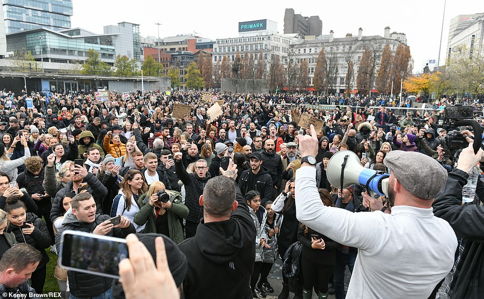 Hundreds of people gathered in Piccadilly Gardens in central Manchester today to protest against the national lockdown.