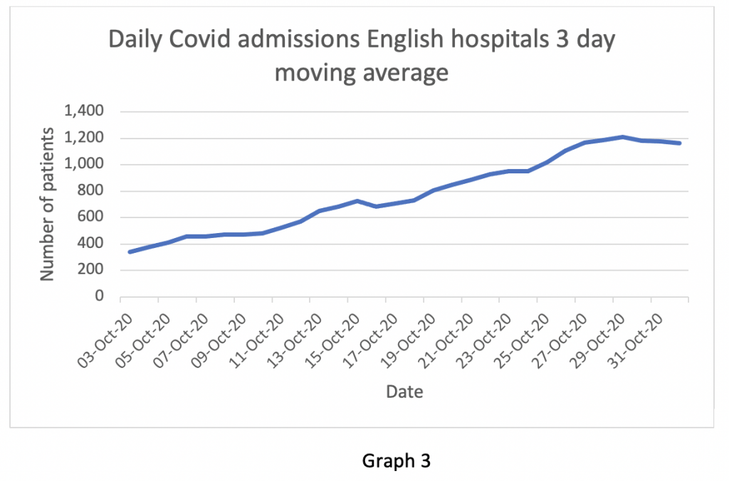 Graph 3 is a graph of the daily Covid admissions in hospitals across England expressed as a three day moving average. Seems to have flatlined for the last week. Unfortunately, Sir Simon forgot to inform the public with respect to the daily discharge figures of Covid patients, so I can’t provide a graph of how discharges compare with admissions. Anecdotally I am informed that most patients spend three to four days in hospital and are then discharged, so in many hospitals the influx of symptomatic Covid patients is balanced by discharges.
