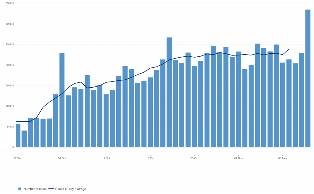 Imperial’s REACT study is now showing R fell below 1 before lockdown, bringing it into line with KCL’s ZOE app, which yesterday reported R at 0.9. On the other hand, yesterday saw a record number of “cases”: 33,470 reported, up by more than 10,000, or 46%, on the day before. Unusually, Stephen Powis, the NHS Medical Director speaking at the Downing Street briefing downplayed the rise, saying it is important to look at the seven-day average, which is about 22,000, rather than one day. Is Project Fear on pause for a moment? Worth noting that testing was also at record levels yesterday, which may be part of the explanation.