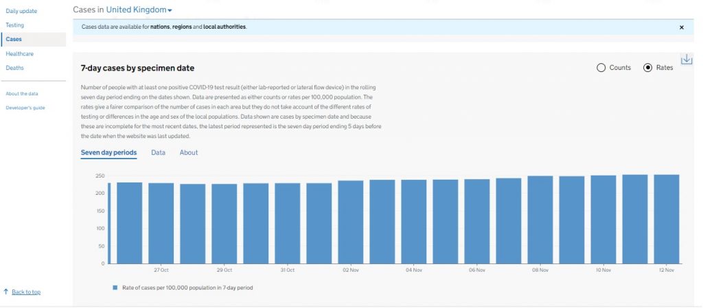 Stop Press: If you look at the moving seven-day average for cases from October 26th to November 12th, there’s not much sign of the “exponential growth” we heard about on October 31st, either. Chris Whitty’s 50,000 cases a day and 1,000 deaths a day – or was it 4,000? – now look even more embarrassing than Sir Patrick Vallance’s scaremongering.