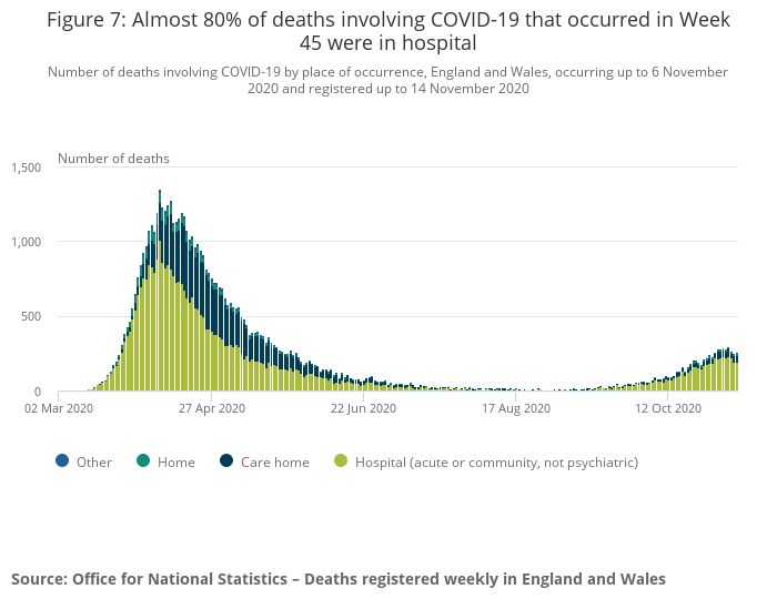 The ONS data released yesterday for the w/e November 6th suggests not terribly well. 1,124 people died with Coronavirus in England and Wales on April 8th, the peak of the first wave (1,445 in the whole of the UK), whereas the worst day in this latest data set was November 3rd in which there were 298 deaths in England and Wales. Far from being “twice as bad or more”, that’s roughly 25%.