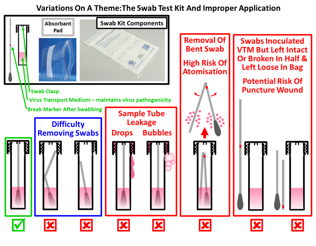 The lab where the real-time PCR assay was run was kept under positive pressure for processing purposes, which meant no air from other areas was supposed to enter this room and potentially contaminate the assay. But cross-contamination issues started at the beginning of the process before the samples were taken to the PCR lab. The main causes of cross-contamination are the way members of the public use the swab kits; contamination of the insides of the tubes and cap by the operator; and the contamination of the thread of sample tubes with sample medium as shown below. These issues are exacerbated by the poor quality of most sample tubes/caps and suppliers’ mix-and-matching tubes to caps, so some of them don’t fit properly.