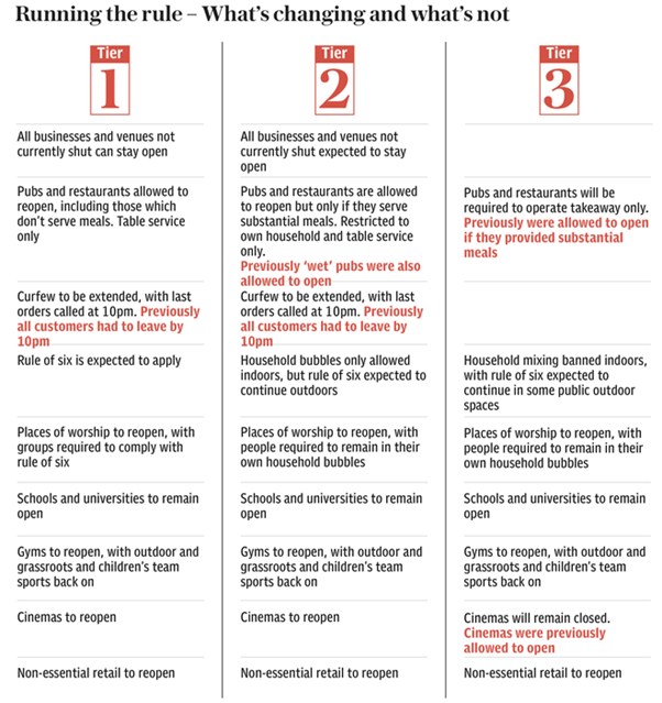 The new tier system is jolly careful indeed. The Telegraph as more on its implications for pubs, shops and services.