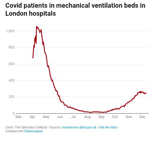 This shows that only about 80% of ventilation beds are occupied, which is below average for the time of year. While it’s true that absolute numbers of ICU patients are a little above average in London at the moment, as far as hospital capacity is concerned that is not the crucial issue as long as hospitals are within their surge capacity, which they are.