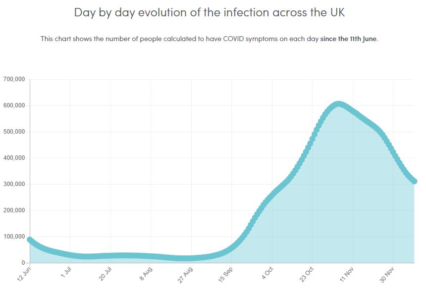 And this is the ZOE app graph of estimated UK symptomatic Covid (which relies on reported symptoms so avoids most of the PCR false positive problems).