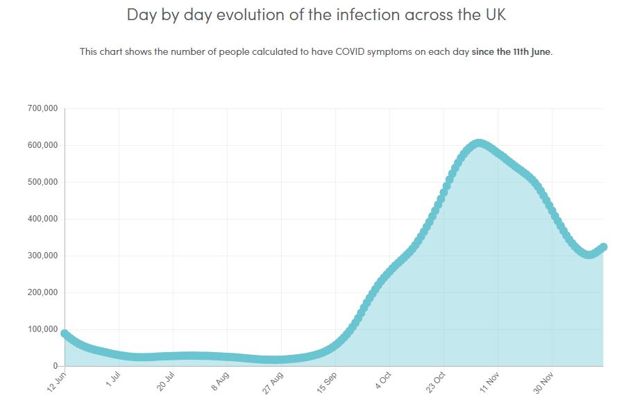 Tim Spector’s ZOE survey App, which counts symptomatic people testing positive, presents a less alarming picture, estimating that there 302,652 infected people in the whole of the UK on December 12th, representing 0.45% of the population.