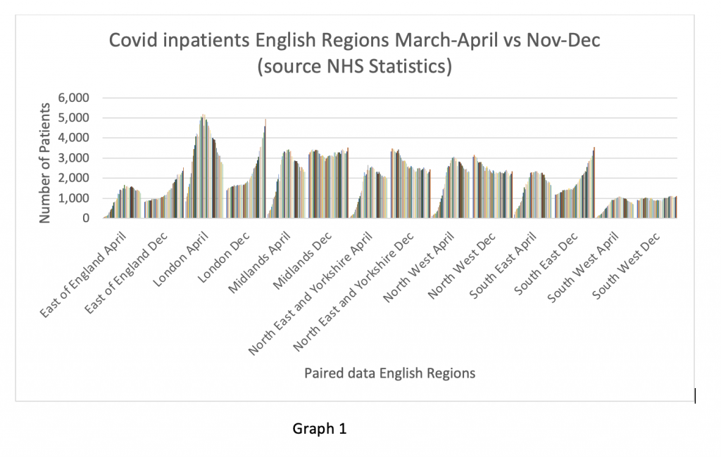 Firstly, a look at the headline figures for inpatients across English regions (Graph 1). I have expressed these figures as paired data comparing March – April with Nov – December 28th. There are clearly possible errors here in the sense that we know when the spring peak happened and we don’t yet know when the winter peak will occur, or if it has already in some areas. Further, the date selections are arbitrary choices based on the available data, so they may not be directly comparable time series. Nevertheless, observing trends is instructive and does allow us to comment on whether we are in a worse situation now.
