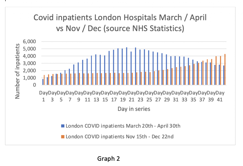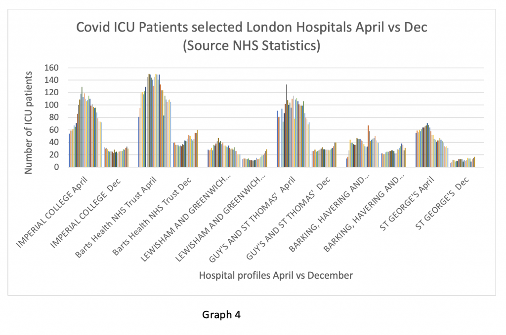 Looking at more detailed comparisons from individual hospitals in London, the difference between the spring and the winter so far is clear (Graph 4). Again, it must be borne in mind that we don’t know when the winter peak will arrive, so these are not direct comparisons and the data on Graph 4 only goes up to December 22nd. That said, it is obvious that with the exception of two District General Hospitals (Lewisham in the South East and Barking in the North East sector), London hospitals are nowhere near the spring peak – and these selected units are currently the most hard pressed in the capital. There is no question that things are difficult in some London hospitals right now and things may very well get more difficult before they improve. Nevertheless, the published figures do not support the assertion that the overall situation is as bad as the spring to date.