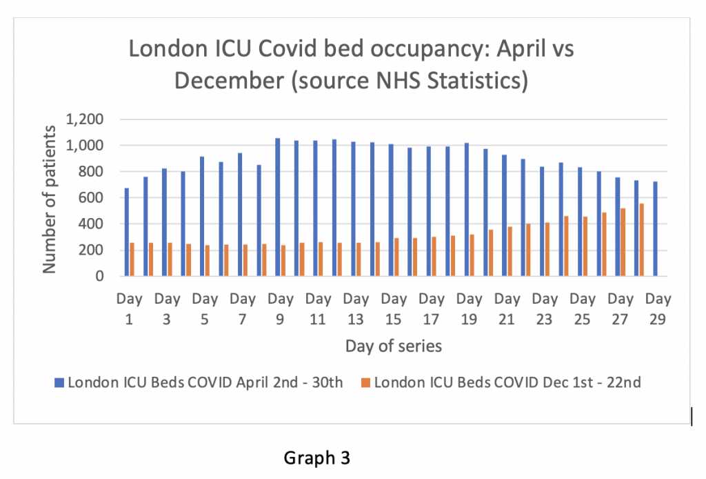 The London inpatient figures, which show the most dramatic rise in the last week, are shown in Graph 2. While on a rising trend, the spring peak has not been exceeded as of December 28th. It is still debatable what has caused the sudden acceleration in cases. Circumstantial evidence suggests that the new variant is spreading faster in London, the South East and the East of England than in other areas, but there is insufficient evidence as yet to show causation. A paper published today by NERVTAG contains interesting data suggesting that the “new strain” VOC 202012/01 may be more contagious than the previously established variant. Luckily, the data so far also suggest there is a lower hospitalisation rate with the new variant (0.9% vs 1.5%), but this difference did not achieve statistical significance in view of the limited sample size. We await further analysis with interest.