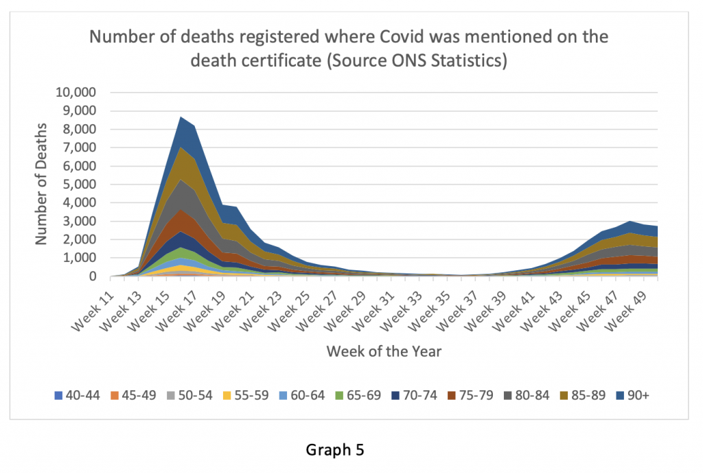 Graph 5 shows the ONS Death registration data for this year up to Week 50 (w/e December 11th) for deaths where Covid was mentioned on the death certificate. The difference between the spring and the winter is starkly apparent. Readers should bear in mind that there is a lag between the time of a death and its appearance in the statistics, so it is very possible that the numbers for weeks 51, 52 and the initial weeks of 2021 may yet rise, but it’s hard to see how the spring death peak of 2020 will be exceeded in the immediate future. I also observe that the Vallance/Whitty prediction of 4,000 deaths per day (28,000 per week), has not so far materialised.